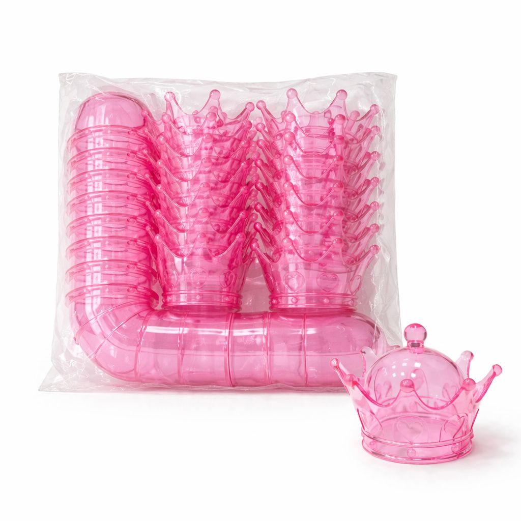 Caramelera Plastica Corona de color Rosa Transparente con 12 Unidades cada paquete. Ideal para Souvernir en eventos y Fiestas.