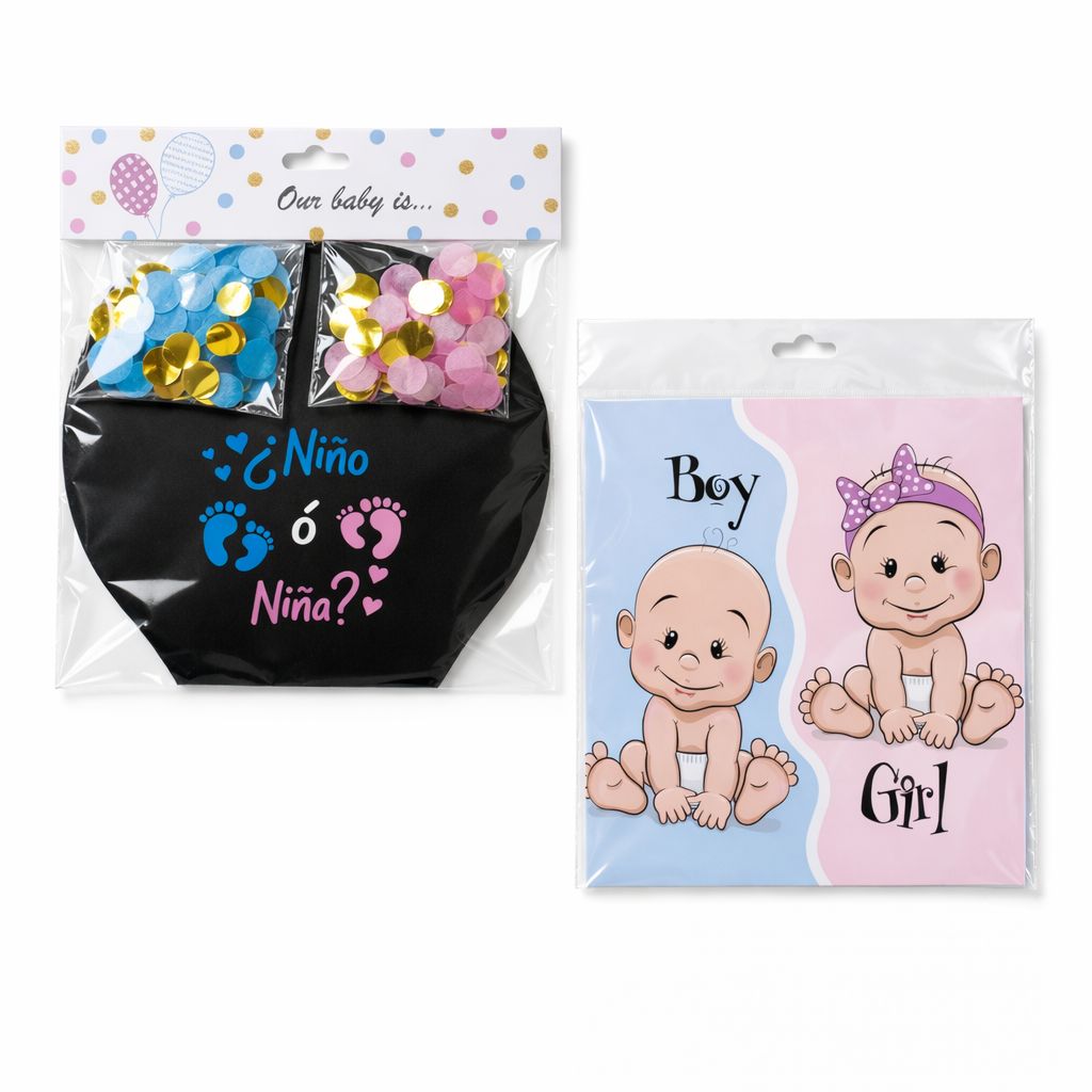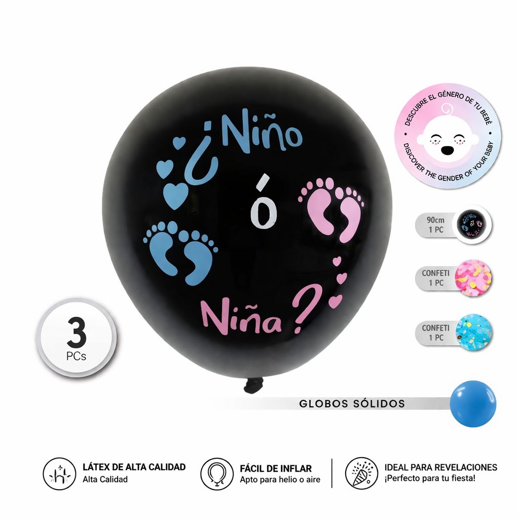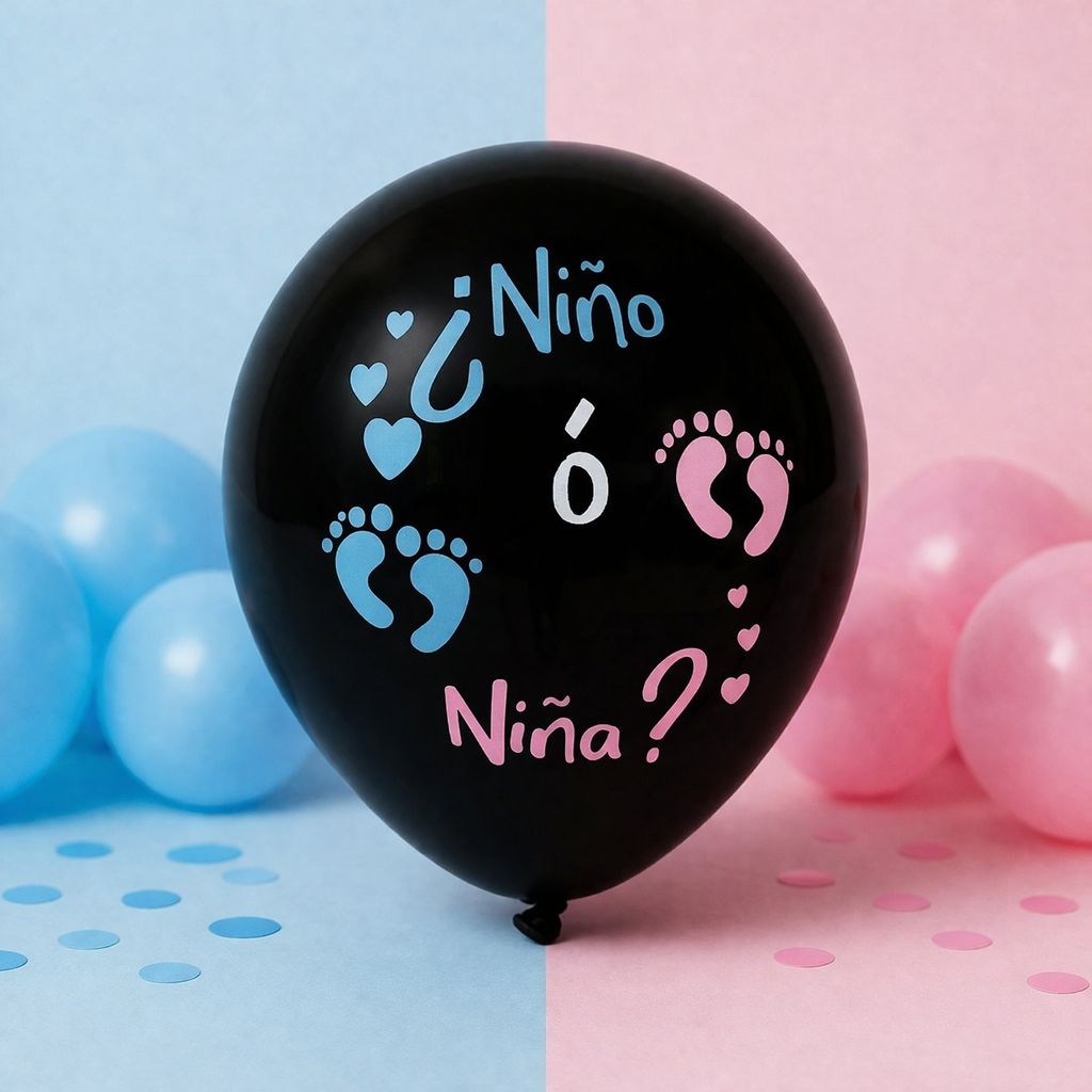 Globo para Revelación de Género color negro con texto con confetis color rosado con dorado o celeste y dorado para colocar el el confeti del genero del bebé. Ideal para eventos de Revelación de Género o Baby Shower.