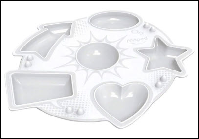 La paleta Maped Color’Peps tiene un diseño divertido y original. Cuenta con seis compartimentos amplios para pintura y espacios especiales para sujetar el pincel, evitando que ruede. Además, es fácil de limpiar. ¡Ideal para dar vida a tus creaciones!