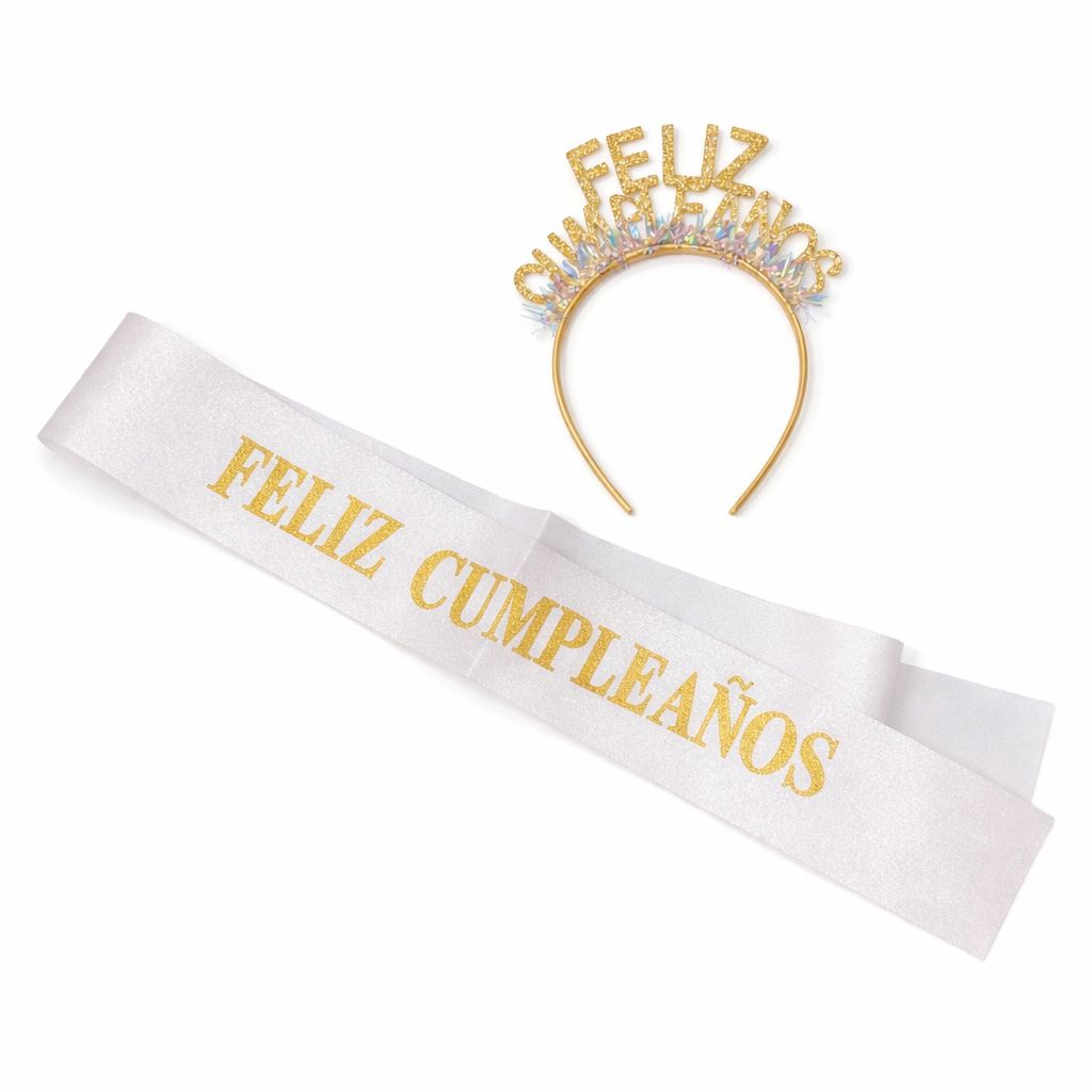 Set de Banda Blanco con ” Feliz Cumpleaños” en color Dorado + Vincha de Feliz Cumpleaños Dorado. Ideal para la persona que festeje su cumpleaños.