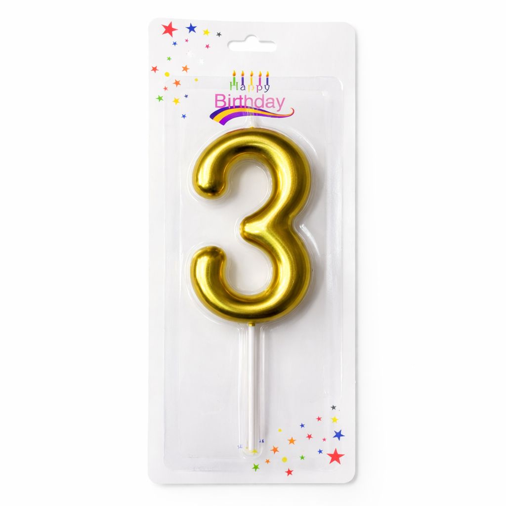 COMPRARVela Topper de color Dorado en Número 3, en tamaño de 9cm ideal para Cumpleaños y festejos.