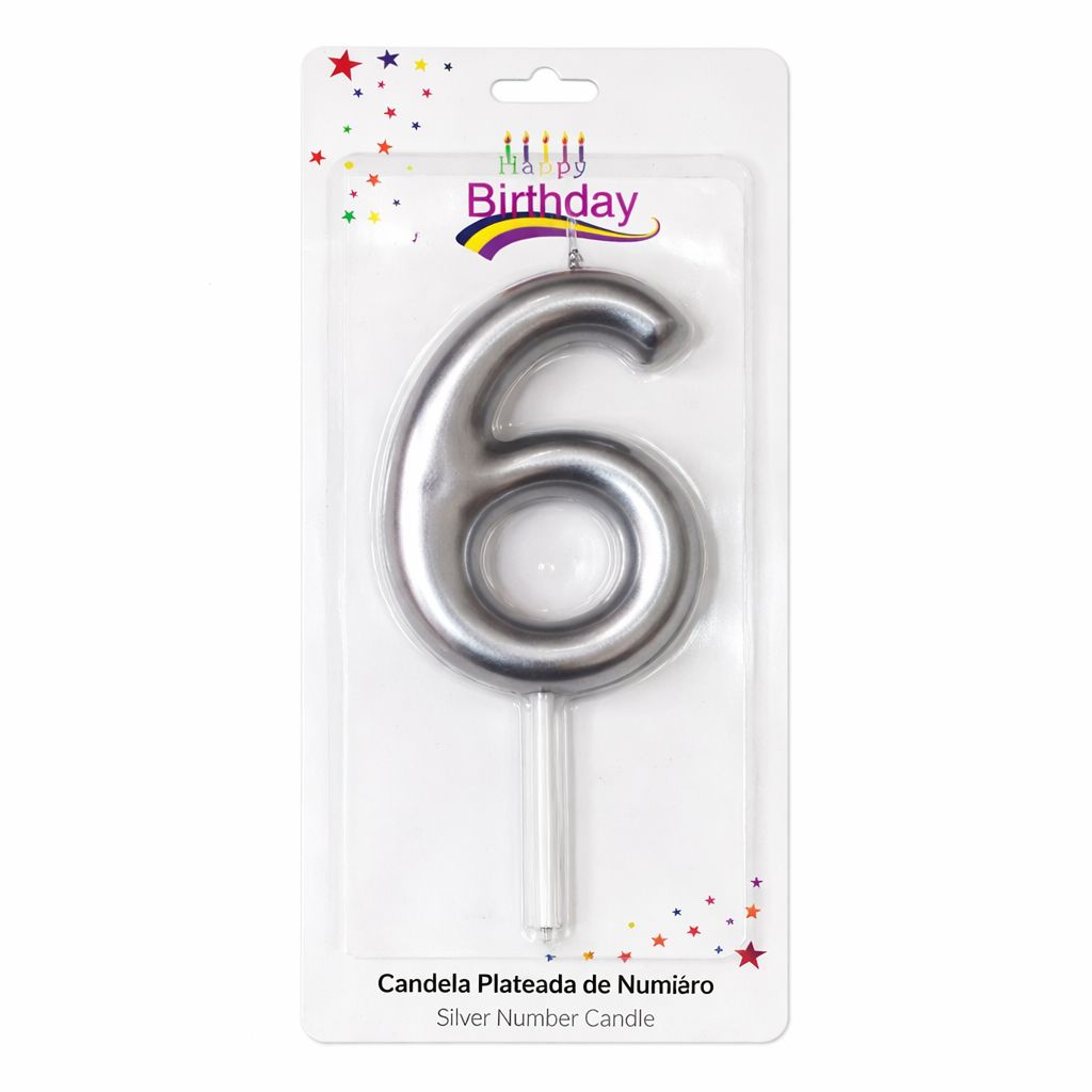 COMPRARVela Topper de color Plata en Número 6, en tamaño de 9cm ideal para Cumpleaños y festejos.